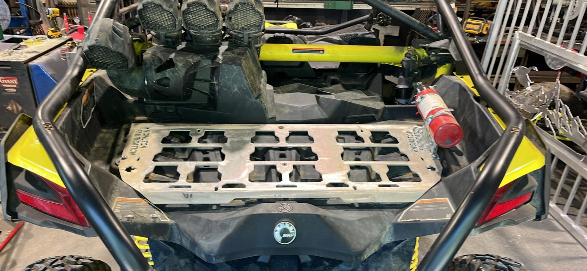 Bolts onto factory X3 rear storage space using factory holes, triple wide pattern with extra offset on the left to fit combinations such as the packout ice chest next to the reinforced wide box, and many other combinations.